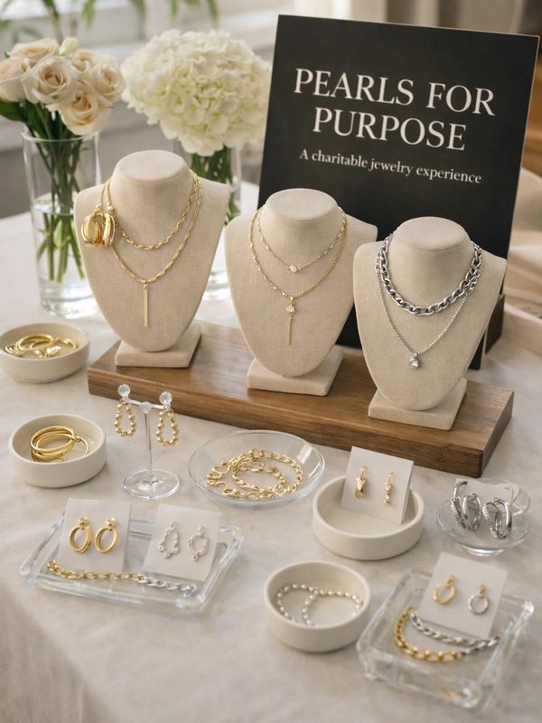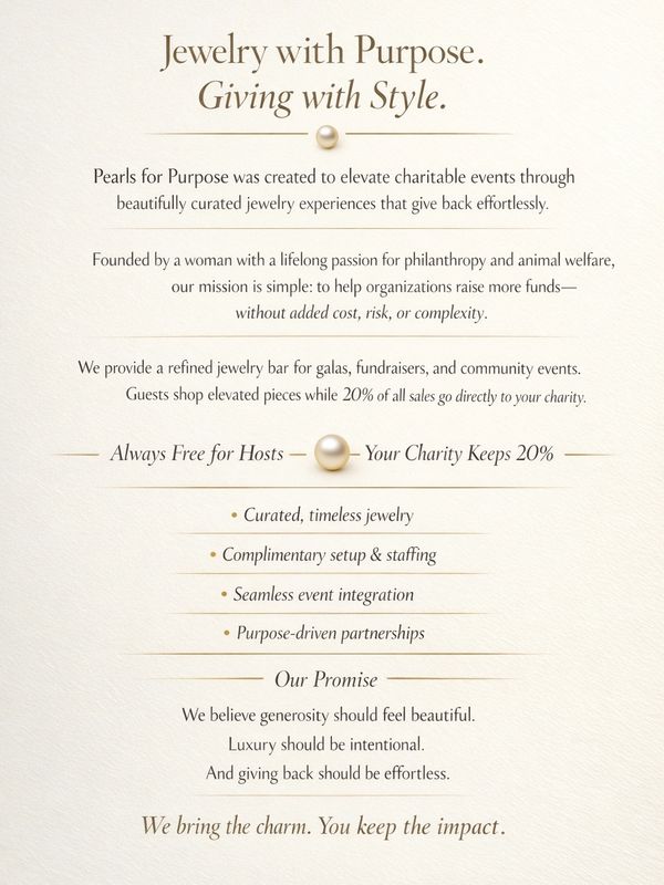 We bring a curated jewelry bar to your gala, fundraiser, or community event. We handle setup + staffing at no charge, and your guests get to shop elevated jewelry while giving back.